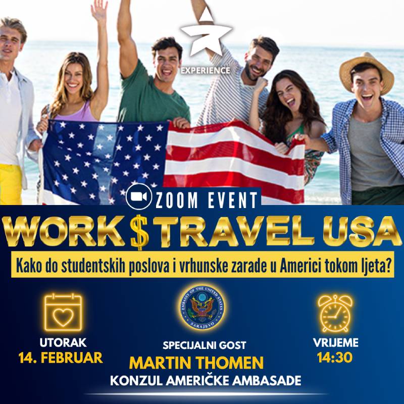 Ne propusti priliku da učestvuješ u ovom specijalnom eventu! Prijavi se ovdje.Program Work & Travel USA je pokrenula američka vlada. U BiH program sprovodi Experience centar za mlade u saradnji sa Ambasadom SAD-a u BiH. Ima za cilj usavršavanje mladih u raznim oblastima, sticanje novih vještina i upoznavanje s novim kulturama.