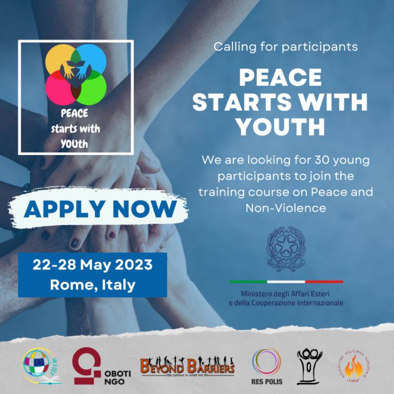We are pleased to announce the call for participants for the training course “Peace starts with YOUth” which will take place in Rome, Italy from May 22 to May 28, 2023. This 7-day program is designed for young people aged 18-25 who are passionate about peace, security, and cooperation issues and are interested in gaining practical skills and knowledge in this field.