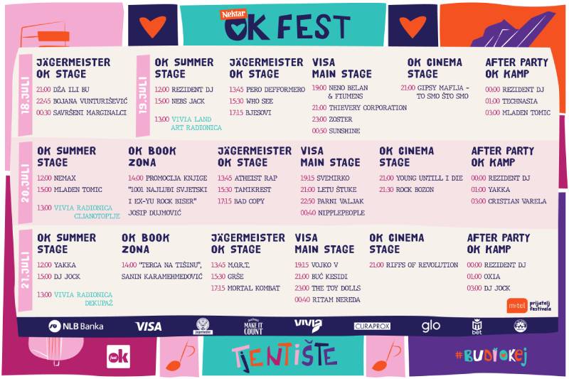 Pred nama je deseto izdanje Nektar OK Festa 2024, koji će se ove godine na Tjentištu održati 19/20/21 jula. Poznate su i satnice kompletnog programa po danima. Festivalski kamp otvoriće svoja vrata dan prije zvaničnog početka festivala /četvrtak, 18. juli od 12:00/ kada smo za one najvjernije OK kampere pripremili sjajan program na Jägermeister OK stage-u u OK kampu, na kojem će istoga dana od 21:00 nastupiti: Dža ili Bu, Bojana Vunturišević, Savršeni Marginalci.