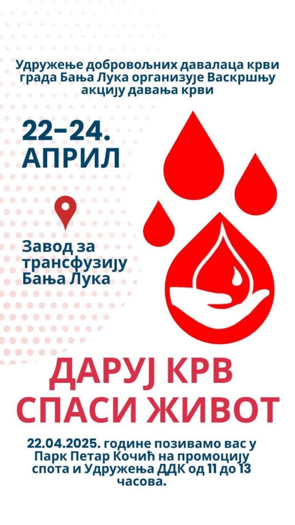 Udruženje dobrovoljnih davalaca krvi grada Banje Luke organizuje veliku akciju darivanja krvi u Banjoj Luci u periodu od 22. do 24. aprila 2025. godine, pod sloganom „Vaskršnja akcija 2025“, a na kojoj će uzeti učešće predstavnici oko 20 srodnih udruženja iz više gradova i opština Srbije, Crne Gore i Republike Srpske.