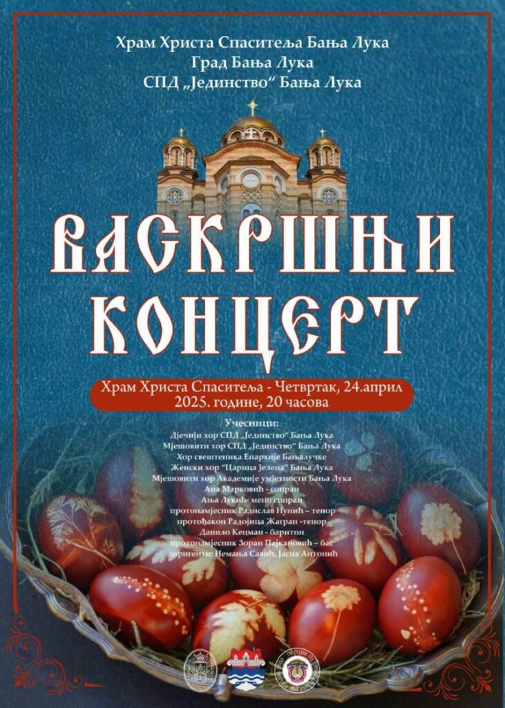 Povodom Vaskrsa, najradosnijeg hrišćanskog praznika, Srpsko pjevačko društvo Jedinstvo iz Banje Luke tradicionalno organizuje Vaskršnji koncert u četvrtak, 24. aprila sa početkom u 20.00 časova u Hramu Hrista Spasitelja.