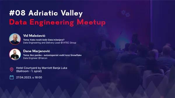 Pozivamo vas na osmi meetup tech zajednice Adriatic Valley. Tema osmog meetup-a je Data Engineering, gdje ćemo imati priliku da poslušamo dva fenomenalna IT stručnjaka i njihove teme: