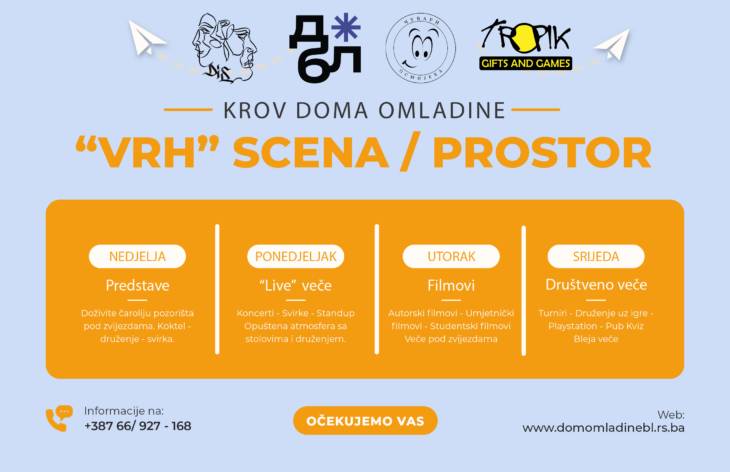 Na krovu Doma omladine zvanično se otvara VRH SCENA. Ovaj projekat posvećen je animiranju mladih, bogaćenju sadržaja Doma omladine, kreiranju i podsticanju kulturnog, zabavnog i edukativnog sadržaja za mlade koji omogućavamo sljedećim rasporedom: