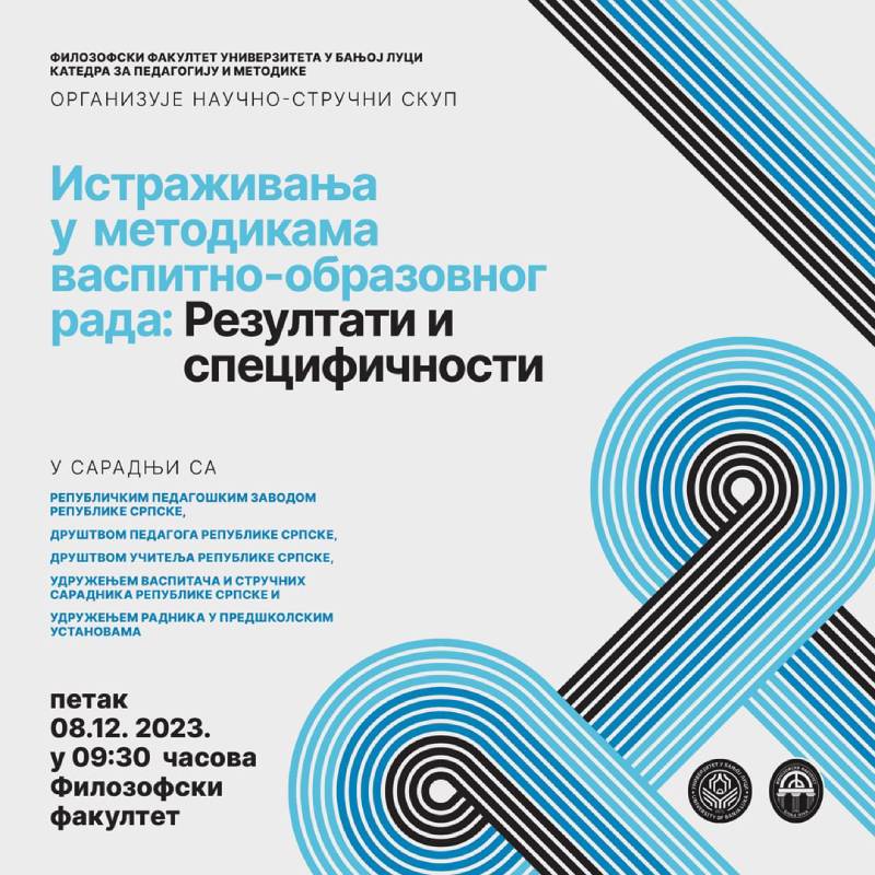 Katedra za pedagogiju i metodike Filozofskog fakulteta Univerziteta u Banjoj Luci organizuje 2. naučno-stručni skup pod nazivom ISTRAŽIVANJA U METODIKAMA VASPITNO-OBRAZOVNOG RADA: REZULTATI I SPECIFIČNOSTI u saradnji sa Republičkim pedagoškim zavodom Republike Srpske, Društvom pedagoga Republike Srpske, Društvom učitelja Republike Srpske, Udruženjem vaspitača i stručnih saradnika Republike Srpske i Udruženjem radnika u predškolskim ustanovama.