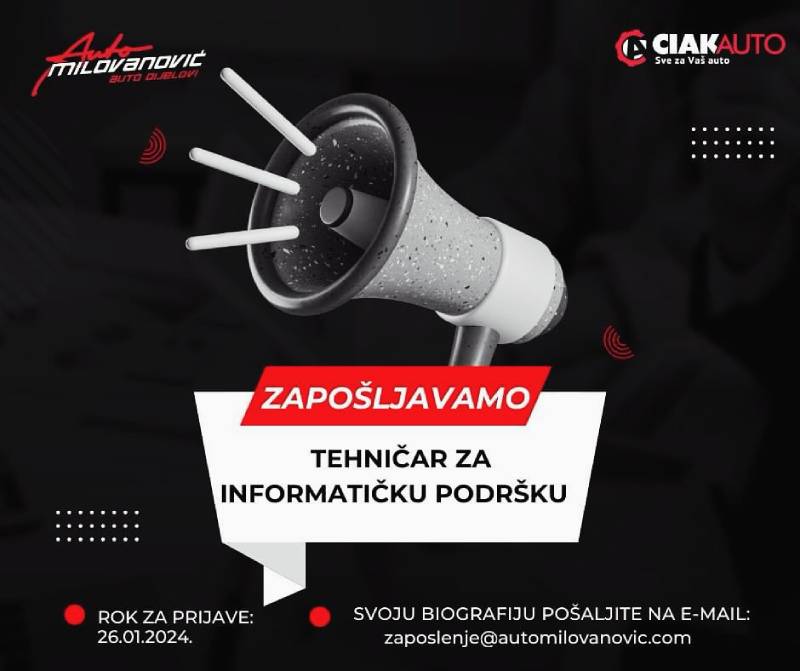 Svoju biografiju za poslove tehničar za informatičku podršku pošalji na e-mail : zaposlenje@automilovanovic.com najkasnije do 26.01.2024. i postani dio našeg tima!
