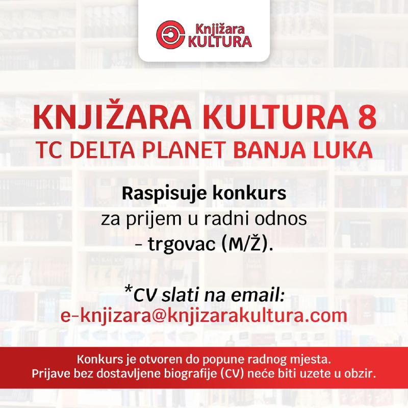 Knjižara Kultura (TC Delta Planet, Banja Luka) raspisuje konkurs za prijem u radni odnos – trgovac (M/Ž).