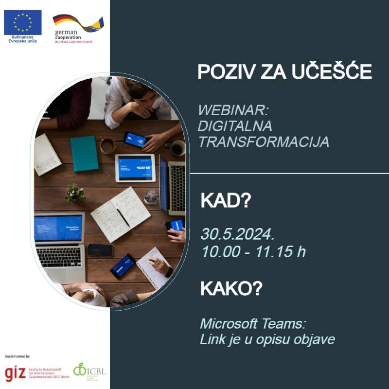 Ovaj webinar pruža sveobuhvatne informacije i praktične savjete za uspješan prelazak u digitalno doba. Prijava Ne propustite priliku da unaprijedite svoje poslovanje i ostanete konkurentni na tržištu. Prijavite se sada i osigurajte svoje mjesto na ovom informativnom i korisnom događaju. Popunite prijavni obrazac OVDJE. Pristupite webinaru OVDJE. IDEMO je jedan od podržanih digitalnih inovacionih hubova u okviru projekta „Inovacije i digitalizacija malih i srednjih preduzeća/EU4DigitalSME“. DIH IDEMO čine Inovacioni centar Banja Luka, Razvojna agencija Republike Srpske, Privredna komora Republike Srpske, Elektrotehnički fakultet Banja Luka, Agencija za razvoj preduzeća EDA. Cilj digitalnog inovacionog huba IDEMO je da malim i srednjim preduzećima pruži stručnu podršku u procesu digitalne transformacije. Projekat koji zajednički finansiraju Evropska unija i Savezno ministarstvo za ekonomsku saradnju i razvoj Savezne Republike Njemačke (BMZ), usmjeren je na uspostavljanje i podršku razvoju digitalnih inovacionih hub-ova (DIH) u Bosni i Hercegovini. Projekat implementira Deutsche Gesellschaft für Internationale Zusammenarbeit GmbH (GIZ).