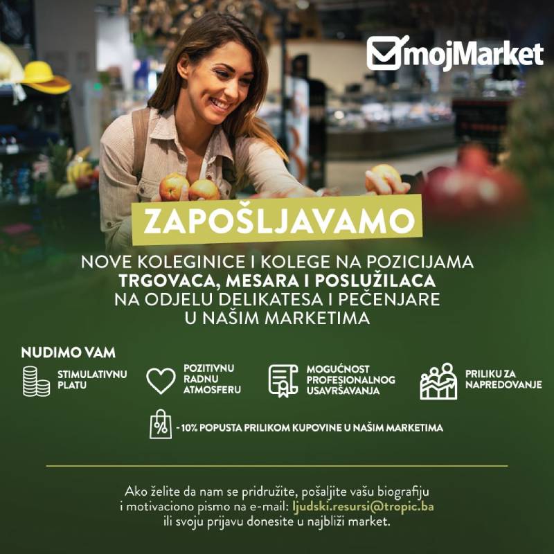 Ispunite prijavu preko našeg sajta https://www.mojmarket.ba/zaposlenje/stalno-otvorene-pozicije/ ili na email adresu ljudski.resursi@tropic.ba ✅