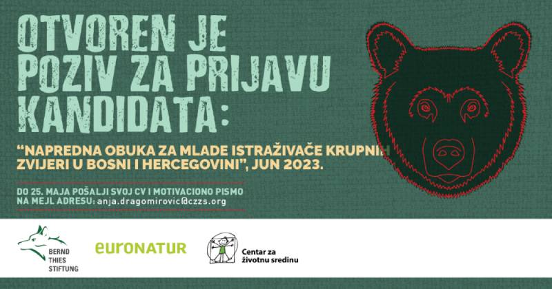 Otvoren je poziv za prijavu kandidata za besplatnu višednevnu obuku za buduće istraživače krupnih zvijeri u Bosni i Hercegovini. Obuka će se održati od 8. do 13. juna na području Krajine (oštine Petrovac, Bihać; planinski masivi Klekovače i Plješevice; u blizini zaštićenih područja Nacionalnog parka “Una” i Strogog rezervata prirode “Prašume Lom”).