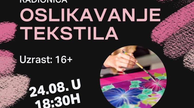 Radionica će se održati 24.08. u 18.30 h u prostoru Društvenog centra Rosulje (park Mladen Stojanović). Potrebno je ponijeti komad odjeće koji želite oslikati (majicu, šal, haljinu,…)