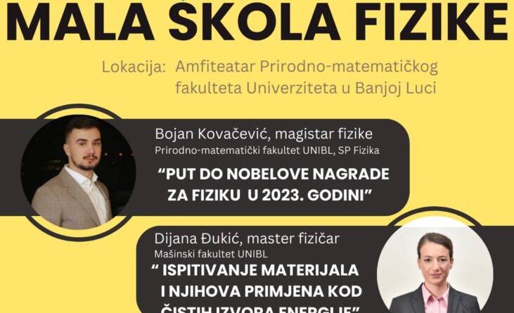 Predavanje “Put do Nobelove nagrade za fiziku u 2023. godini” održaće magistar fizike Bojan Kovačević, dok će predavanje “Ispitivanje materijala i njihova primjena kod čistih izvora energije” održati master fizičar Dijana Đukić.