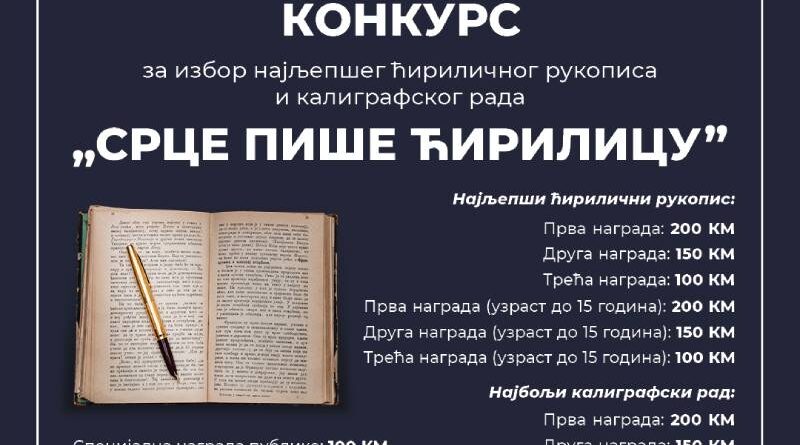Konkurs „Srce piše ćirilicu“ u kojem se traži najljepši ćirilični rukopis i najljepša ćirilična kaligrafija, Muzej Republike Srpske i ove godine raspisao je u dvije kategorije: djeca do 15 godina i odrasle osobe, saopšteno je iz Muzeja Republike Srpske.