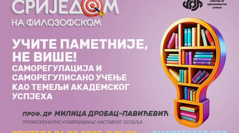 U sklopu kontinuiranog profesionalnog usavršavanja nastavnog osoblja, Filozofski fakultet i Centar za cjeloživotno učenje organizuju predavanje na temu “Učite pametnije, ne više!” – Samoregulacija i samoregulisano učenje kao temelji akademskog uspjeha u srijedu, 26.02.2025. godine u 12 časova u amfiteatru 203. Predavanje će održati prof. dr Milica Drobac-Pavićević, vanredna profesorica sa Katedre za psihologiju Filozofskog fakulteta Univerziteta u Banjoj Luci.