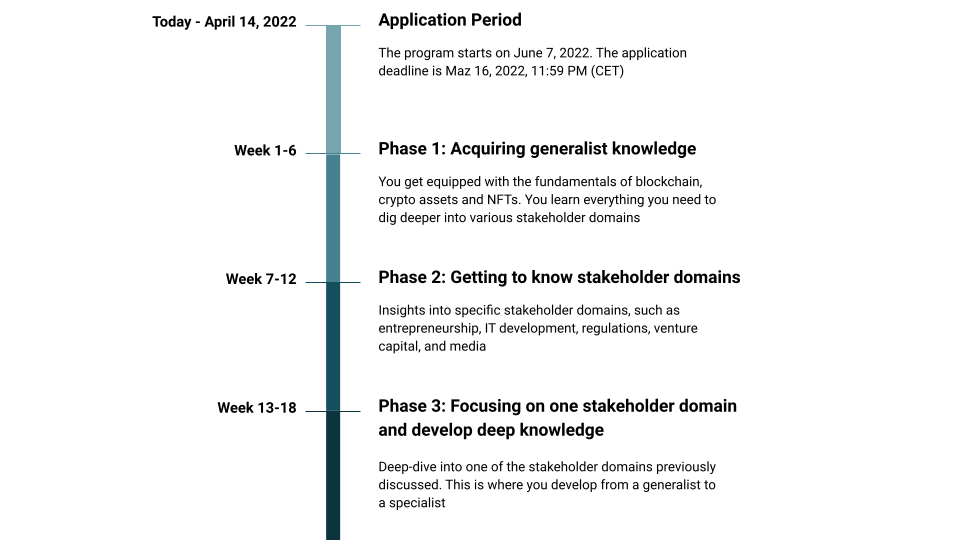 Starting with our first batch on June 7, 2022, we will select a maximum of 100 high-potential candidates and coach them over the course of a 3-phase program over 18 weeks to become entrepreneurs, technologists, lawyers, investors, or multiplicators in NFT. Every two weeks, we will hold a Zoom session to deepen your knowledge and to advance your career in the NFT space.