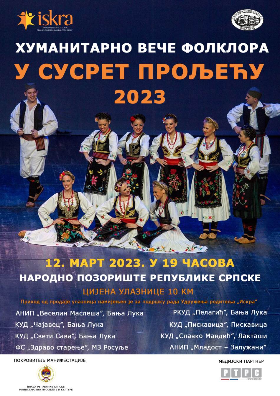 Udruženje roditelja “Iskra” u saradnji sa Narodnim pozorištem Republike Srpske organizuje Humanitarno veče folklora “U susret proljeću 2023”.