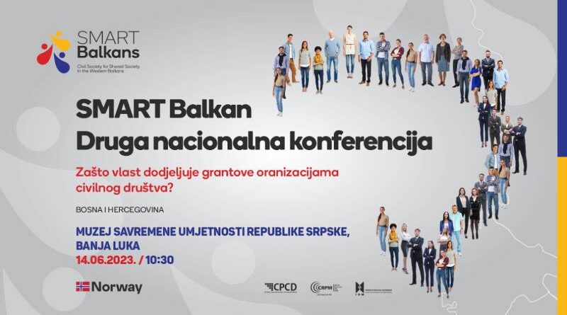 SMART Balkan organizuje drugu Nacionalnu konferenciju koja će se održati u srijedu,14.06.2023. godine sa početkom u 10:30 sati u Muzeju savremene umjetnosti Republike Srpske u Banjaluci. Tema Konferencije je Zašto vlast dodjeljuje grantove oranizacijama civilnog društva?