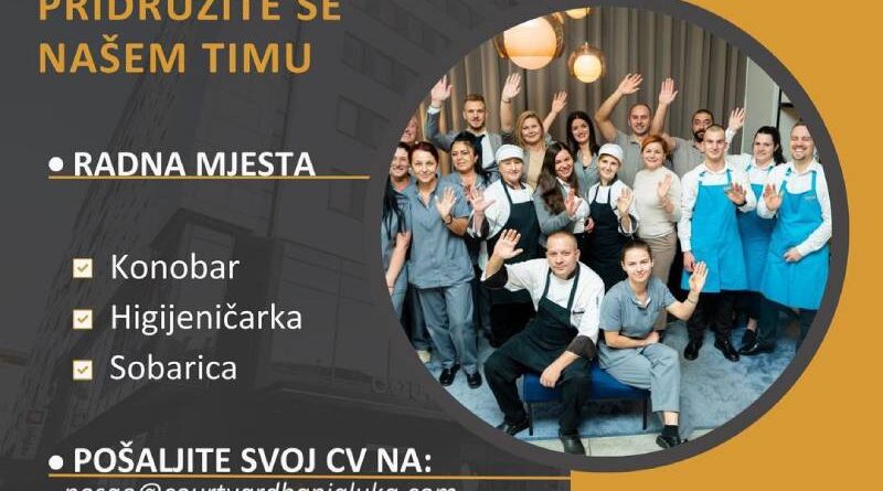 IzdvajamoZapošljavanje Courtyard by Marriott zapošljava 08/06/202308/06/2023 mladibl Courtyard by Marriott, Posao, Zapošljavanje Pridružite se našem timu Radna mjesta: konobar higijeničarka sobarica Pošaljite svoj CV na: posao@courtyardbanjaluka.com View this post on Instagram A post shared by Courtyard by Marriott Banja Luka (@courtyardbanjaluka) Preuzeto sa: Instagram @courtyardbanjaluka