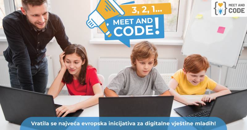 Meet and Code pomaže neprofitnim organizacijama širom Evrope da budu domaćini događaja kodiranja i osnaže djecu i mlade sa tehnologijom i kompetencijama kodiranja koje će im trebati za uspjeh. Inicijativa je usklađena sa EU Code Week.