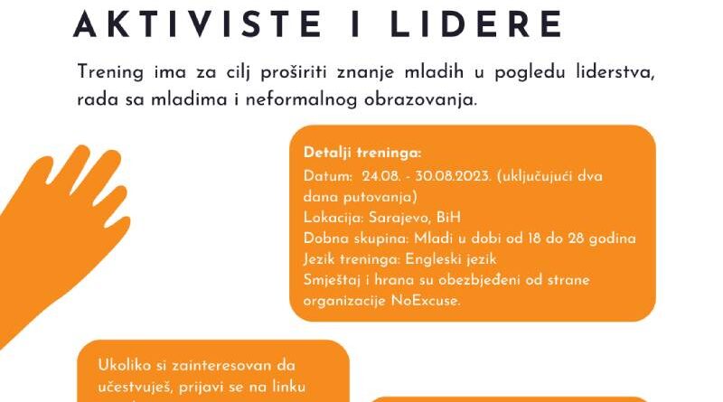 Ako si mlada osoba koja teži proširiti svoje vještine u liderstvu, radu s mladima i neformalnom obrazovanju, ovo je poziv za tebe! Pridruži se treningu za mlade aktiviste i lidere, iskoristi priliku za osobni rast i upoznaj druge mlade ljude sličnih interesa u dobi od 18 do 28 godina.