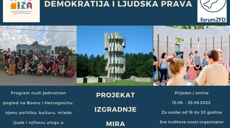 Most mira i forumZFD BiH vas pozivaju da uzmete učešće u desetom izdanju programa “Programa za izgradnju mira- Demokratija i ljudska prava u Bosni i Hercegovini”. Program će se održati u periodu od 15.9. do 25.9.2023. godine, s tim da će se prvi dio (15.9.- 20.9. ) odvijati putem Zoom online platforme, a drugi, praktični, dio će se odvijati na terenu u Prijedoru i dokolici (22.9.- 25.9.2023. godine)