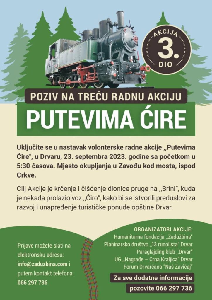 Uključite se u nastavak volonterske radne akcije “Putevima Ćire” u Drvaru, 23. septembra 2023. godine sa početkom u 5.30. Mjesto okupljanja u Zavođu kod mosta, ispod Crkve.