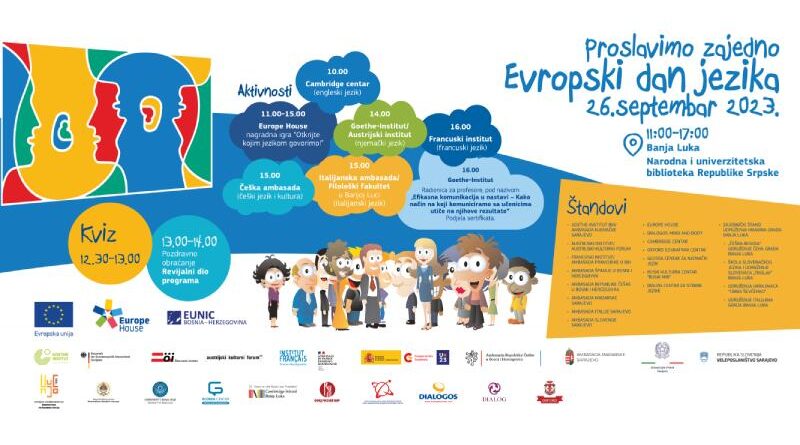 Centralni događaj proslave Evropskog dana jezika se održava 26.9.2023. u Banjaluci u Narodnoj i univerzitetskoj biblioteci Republike Srpske od 11:00 – 15:00 sati. Ukoliko želite osvježiti svoje znanje jezika, naučiti nešto novo i osvojiti nagrade, pridružite nam se i učestvujte u zanimljivim događajima za za Evropski dan jezika!
