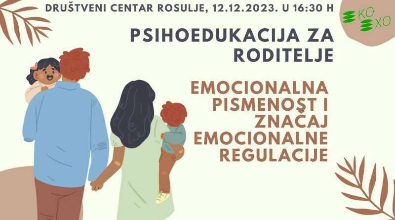 Novo psihoedukativno predavanje za roditelje „Emocionalna pismenost i značaj emocionalne regulacije“ u organizaciji EKO EHO – Centra za edukaciju i promociju zdravog života biće održano u Društvenom centru Rosulje, 12. decembar u 16.30 časova.