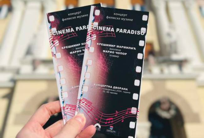 U Koncertnoj dvorani Kulturnog centra Banski dvor u ponedjeljak, 29. januara u 20.00 časova, biće održan koncert filmske muzike „Cinema Paradiso“ u izvođenju virtuoznog klavira i čarobne violine -Krešimir Marmilić – violina i Mario Čopor – klavir.