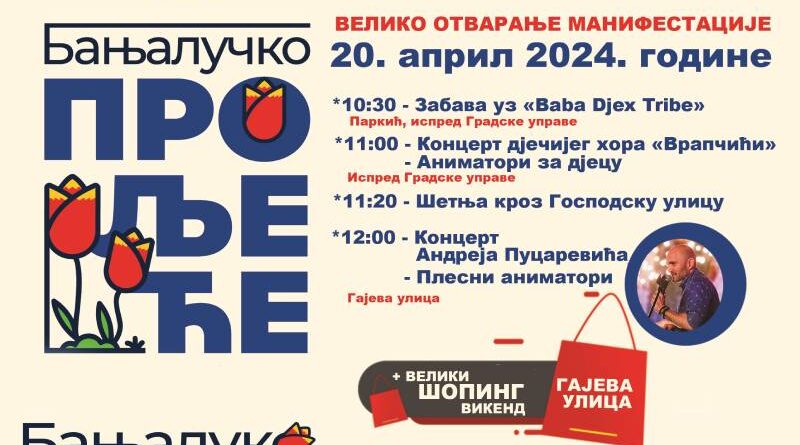 Svi sugrađani pozvani su da prisustvuju otvaranju manifestacije „Banjalučko proljeće“, koja će u subotu započeti od 10.30 časova proljećnom zabavom u „Parkiću“ i ispred Gradske uprave uz “ Baba Djex Tribe ”, nakon čega slijedi zabava za najmlađe sugrađane uz animatore i koncert Dječijeg hora “Vrapčići”. Program će biti nastavljen u Gajevoj ulici, gdje vas od 12.00 časova očekuje sjajna atmosfera uz nastupe plesnih animatora i koncert banjalučkog umjetnika Andreja Pucarevića.