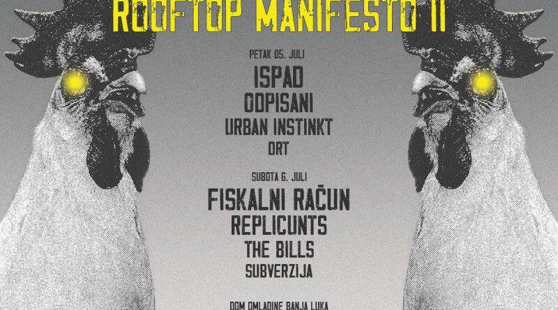 Udruženje građana Baterflaj organizuje 05. i 06. jula dvodnevni punk festival Rooftop Manifesto II na krovu Doma omladine, u Banjaluci. Jednodnevna karta iznosi 15, a dvodnevna 20 maraka. Početak programa oba dana zakazan je za 20.30 sati.