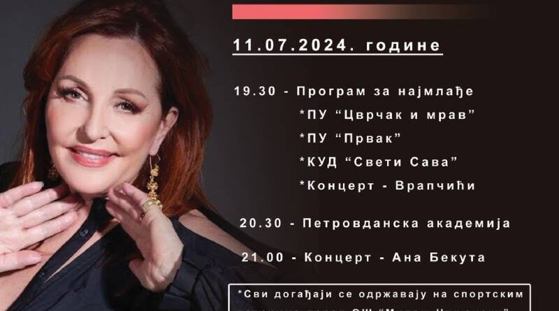 Nakon toga, od 20.30 časova biće održana svečana Petrovdanska akademija, a na kojoj će učestovati ANIP „Veselin Masleša“, Pjevačka grupa učenika OŠ Miloš Crnjanski, a biće DIS pozorište mladih izzvešće i predstavu „Pokondirena tikva, dok će od 21.00 čas biće održan veliki koncert Ane Bekute, takođe na sportskim terenima pored Osnovne škole.