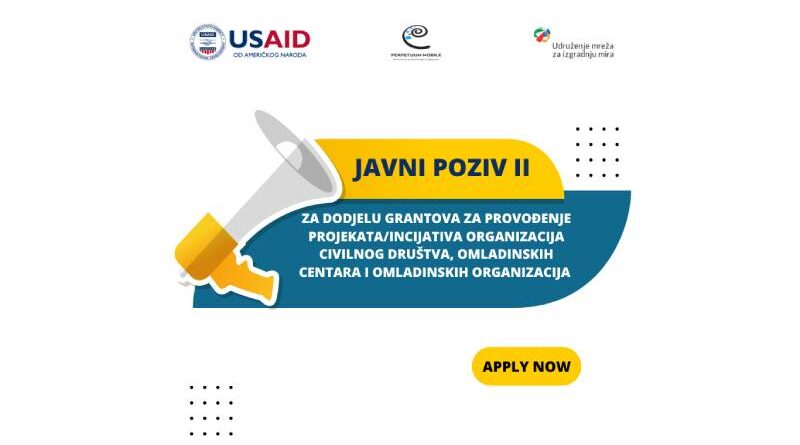 U partnerstvu sa Mrežom za izgradnju mira, u okviru USAID-ovog projekta „Snaga lokalnog/Podrška lokalnim resursnim organizacijama (LRO/A)“ „Perpetuum mobile – Institut za razvoj mladih i zajednice“ Banja Luka objavljuje drugi Javni poziv za dodjelu finansijske podrške projektima organizacija civilnog društva, omladinskim organizacijama i omladinskim centrima na lokalnom nivou koji rade na jačanju svojih kapaciteta. U sklopu projekta „Mali izvor velikih promjena“ pozivamo sve organizacije sa područja šire banjolučke regije (Banja Luka, Prijedor, Gradiška, Srbac, Prnjavor, Laktaši, Mrkonjić Grad, Derventa, Kozarska Dubica, Novi Grad, Čelinac, Kotor Varoš, Teslić, Šipovo, Jezero, Kostajnica) da se odazovu našem pozivu.
