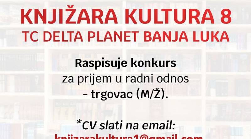 Knjižara Kultura 8, TC Delta Planet – Banja Luka, raspisuje konkurs za prijem u radni odnos – trgovac (M/Ž).