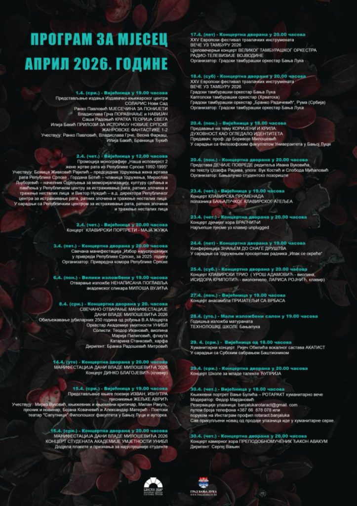 Aprilski program donosi dinamičan spoj umjetnosti, emocije i znanja, čineći Banski dvor mjestom susreta različitih generacija i interesovanja.